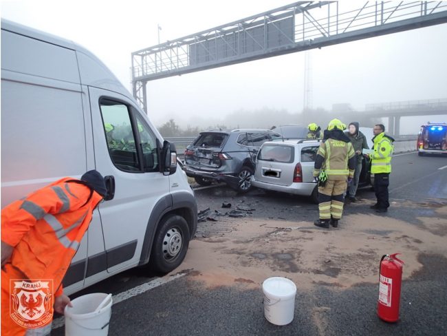 Ob 8.53 je za izvozom Tržič (gorenjska avtocesta) v smeri proti Karavankam, prišlo do naleta štirih osebnih vozil. Gasilci GARS Kranj smo požarno in prometno zavarovali kraj nesreče, sanirali razlite tekočine po cestišču, odklopili akumulatorje. Reševalci NMP Kranj so odpeljali eno odraslo osebo in tri otroke.