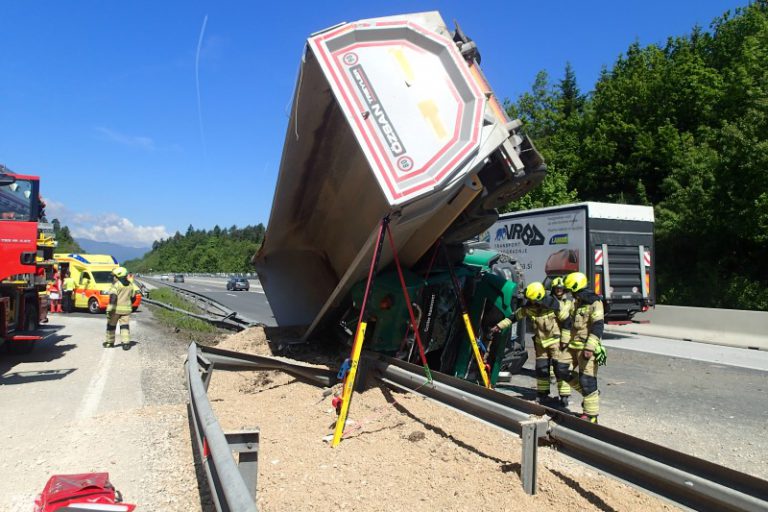 Tovornemu vozilu kiper je počila pnevmatika, vozilo se je prevrnilo in prebilo sredinsko ograjo, ter se ustavilo na nasprotnem vozišču.…